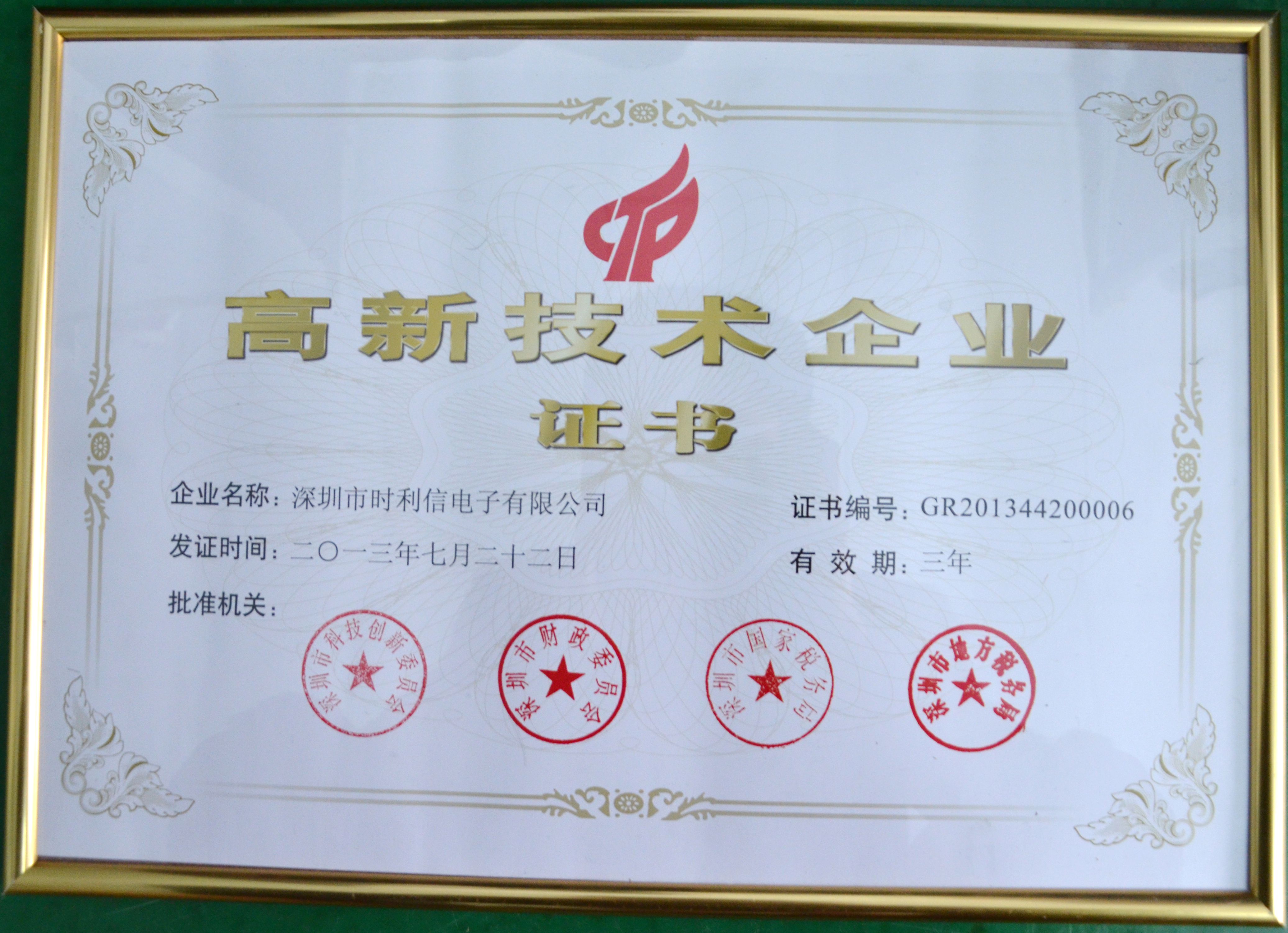 日前,根据科技部、财政部、国家税务总局《高新技术企业认定管理办法》(国科发火【2008】172号)和《高新技术企业认定管理工作指引》(国科发火【2008】362号)规定,经过企业申报,专家评审、会审,相关部门公示等环节,深圳市时利信电子有限公司正式通过了国家高新技术企业认证。