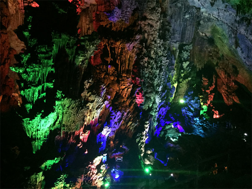 2、我们率先来到“兜率溶洞”,刚进入溶洞就让我们惊叹大自然的鬼斧神工,融水滴水造就了溶岩在彩色灯光地照耀下散发出让人惊愕的色彩斑斓的溶岩。